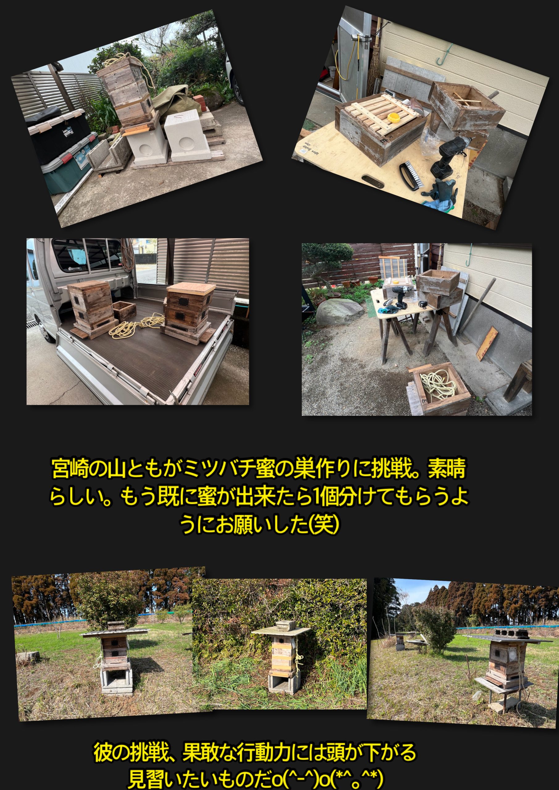 日記 宮崎やま友の挑戦(ミツバチ巣作り) 2026年3月1日 大淀の芋太郎 コメントする 今回やま友から送ってきた写真 何でも興味を持って素晴らしい挑戦である。彼の行動力には頭が下がる。本人の許可をもらってアップした。 created by photogrid
